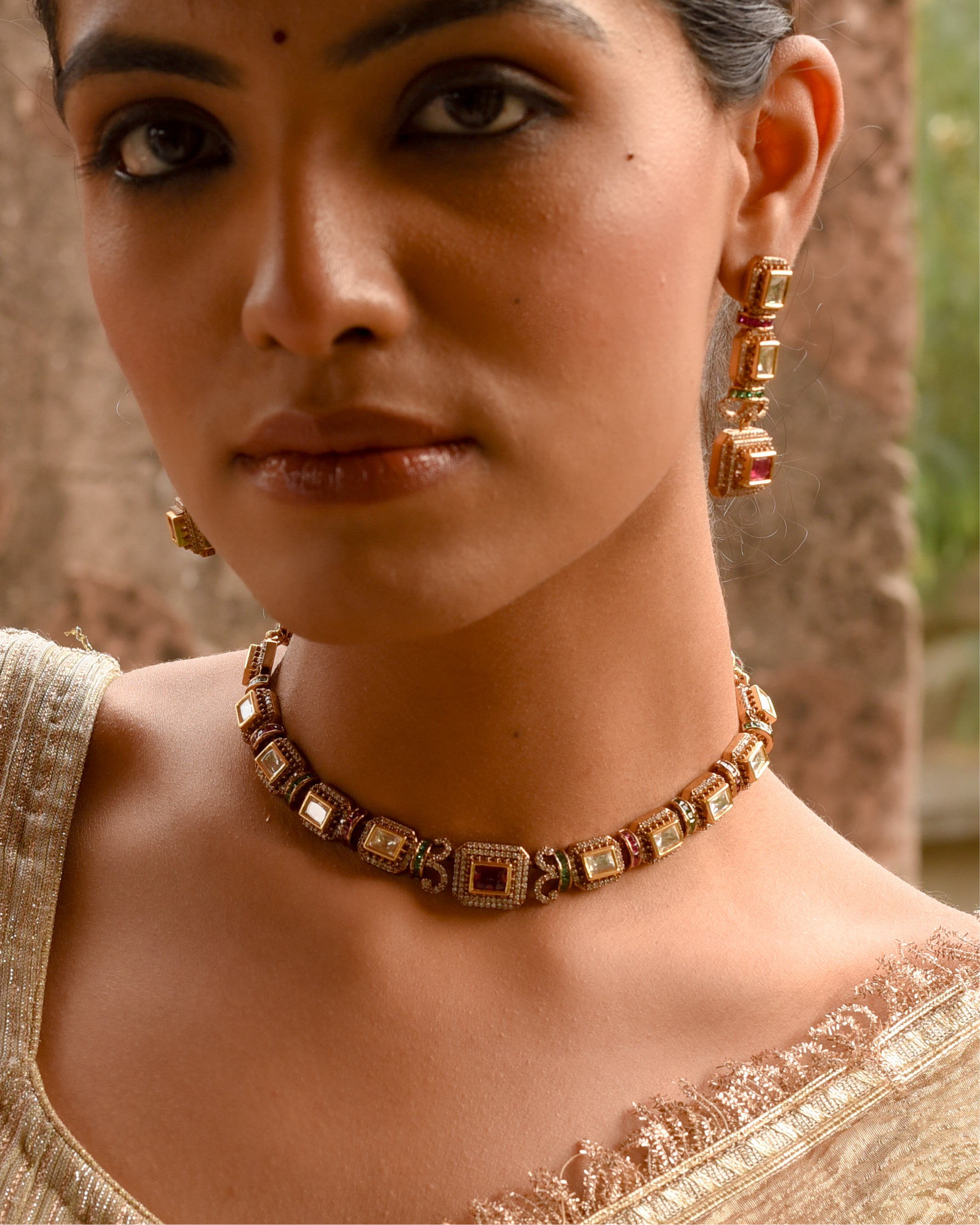 Precision-cut kundan stones arranged in geometric perfection create this sophisticated choker and matching drop earrings, where contemporary minimalism meets traditional Indian craftsmanship.