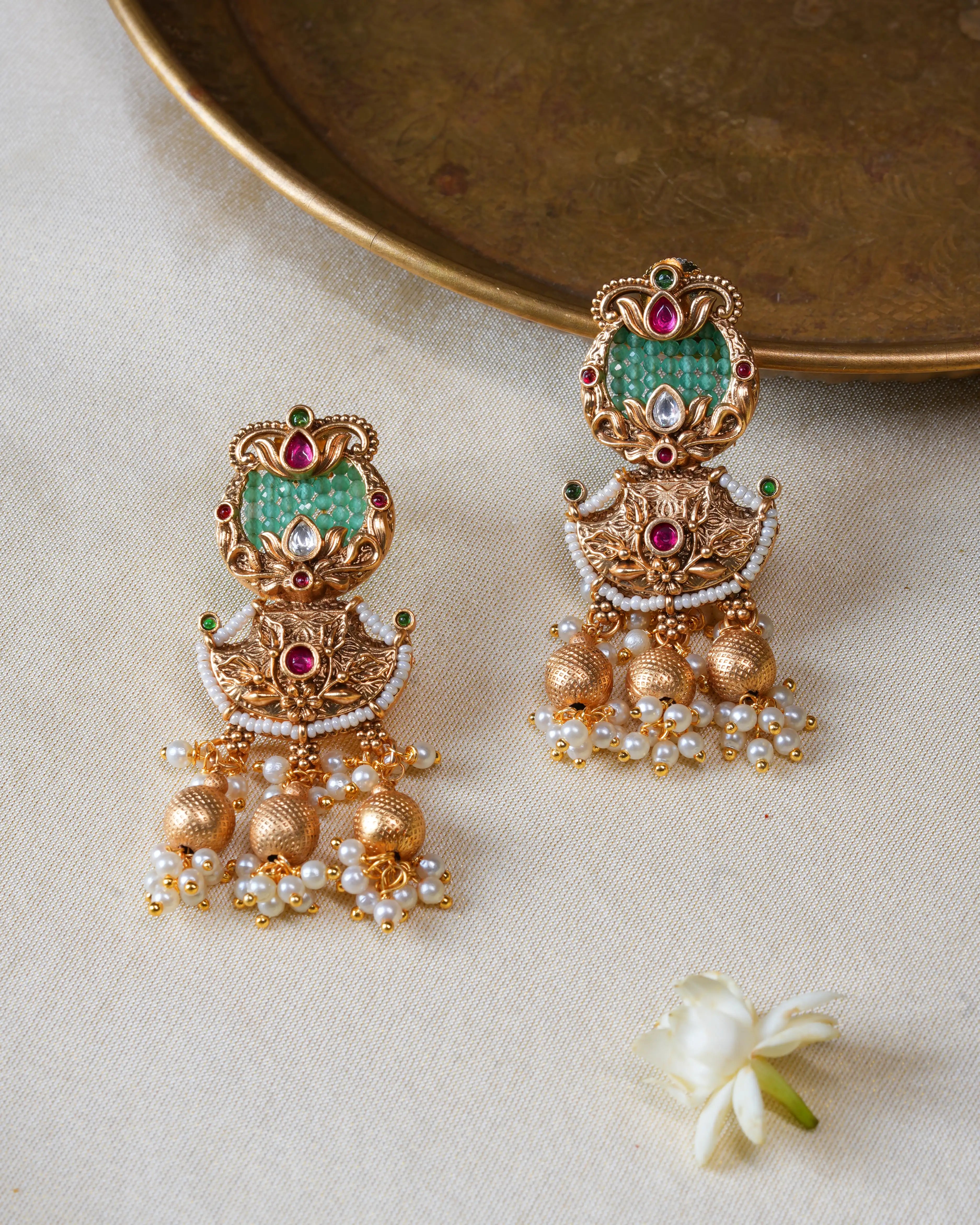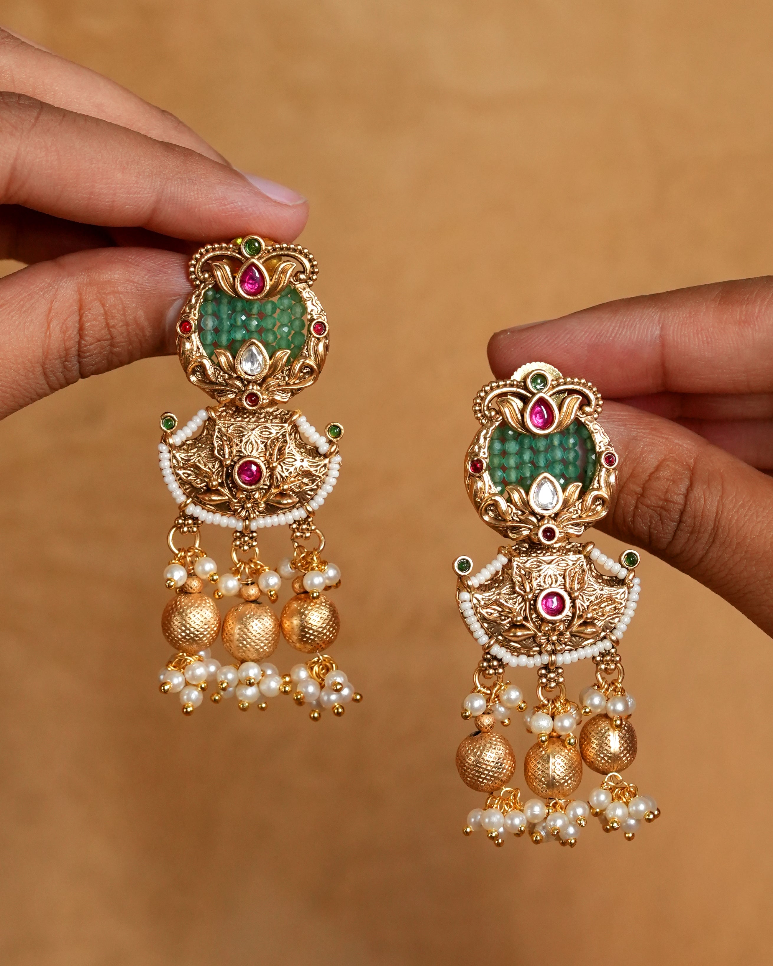Stunning two-tier chandbali earrings featuring vibrant emerald centerpieces complemented by ruby accents and intricate kundan work in antique gold finish. The cascading design showcases ornate filigree patterns with lustrous pearl and gold bead drops that create graceful movement.