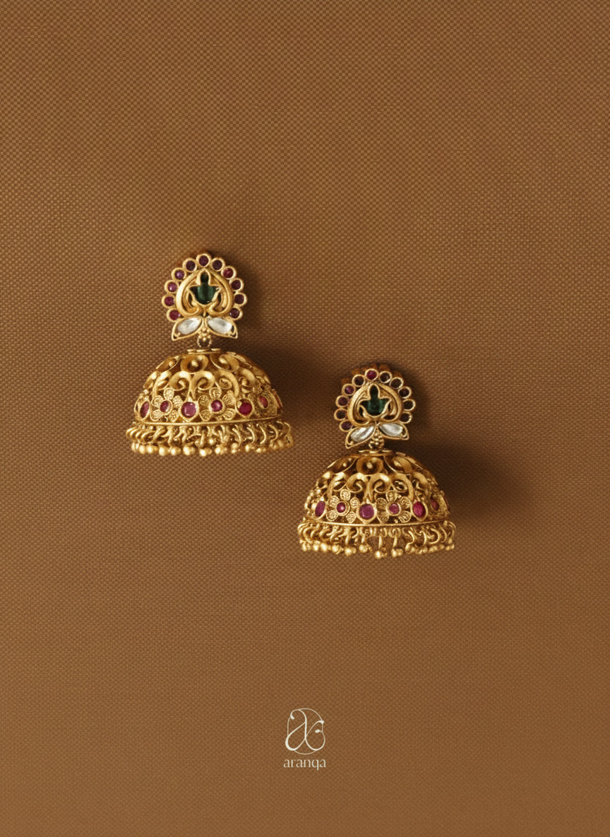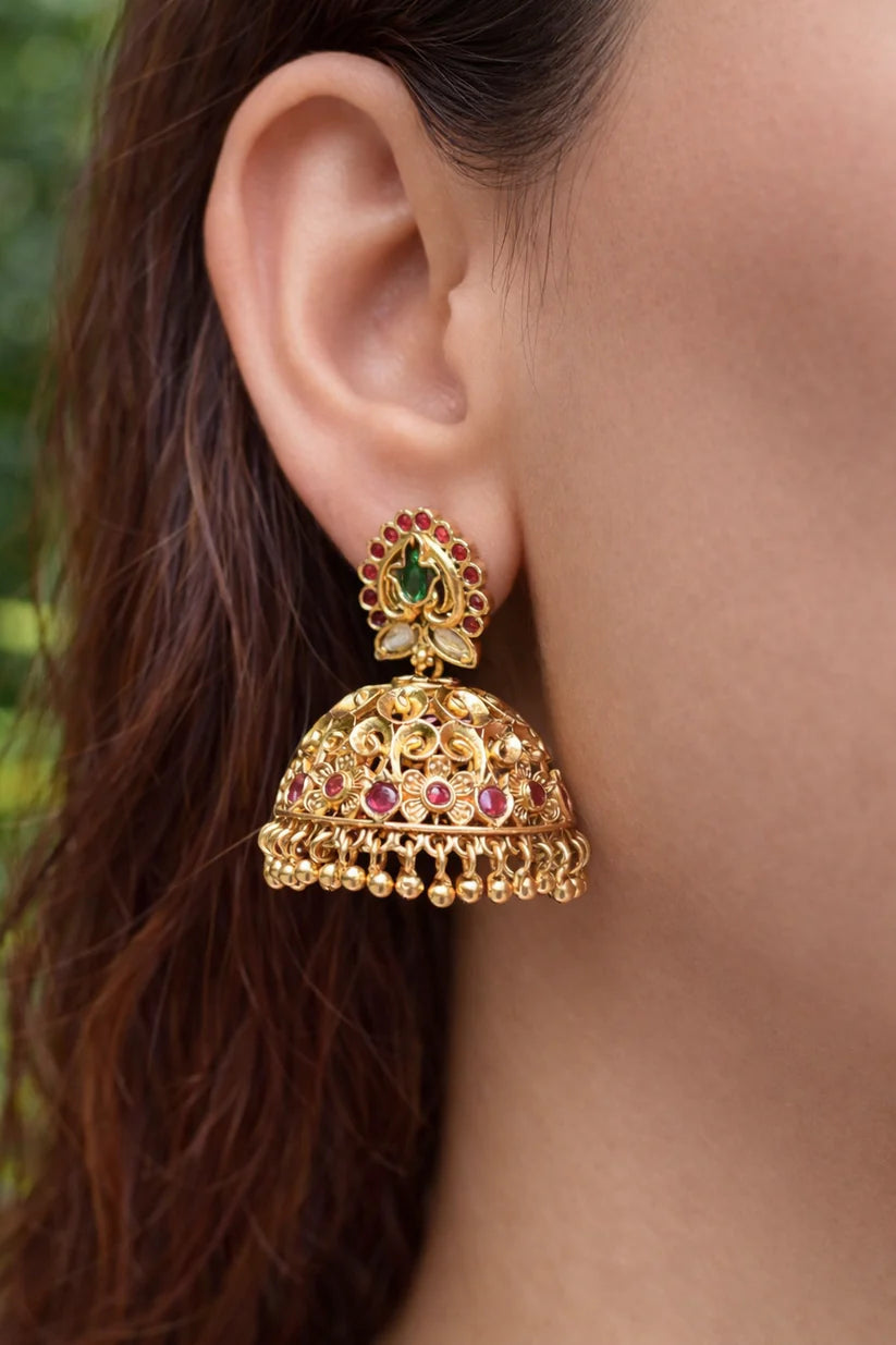 These exquisite gold-toned jhumkas showcase traditional craftsmanship with intricate filigree work and delicate drops that dance with every movement. The ornate dome silhouette features vintage inspired motifs and rich detailing that captures the essence of royal Indian heritage.