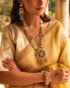 Gold-plated necklace set with pearl strings and kundan work, featuring a floral pendant and chandelier earrings with ruby and emerald stones. This handcrafted bridal set combines traditional elegance with royal sophistication.