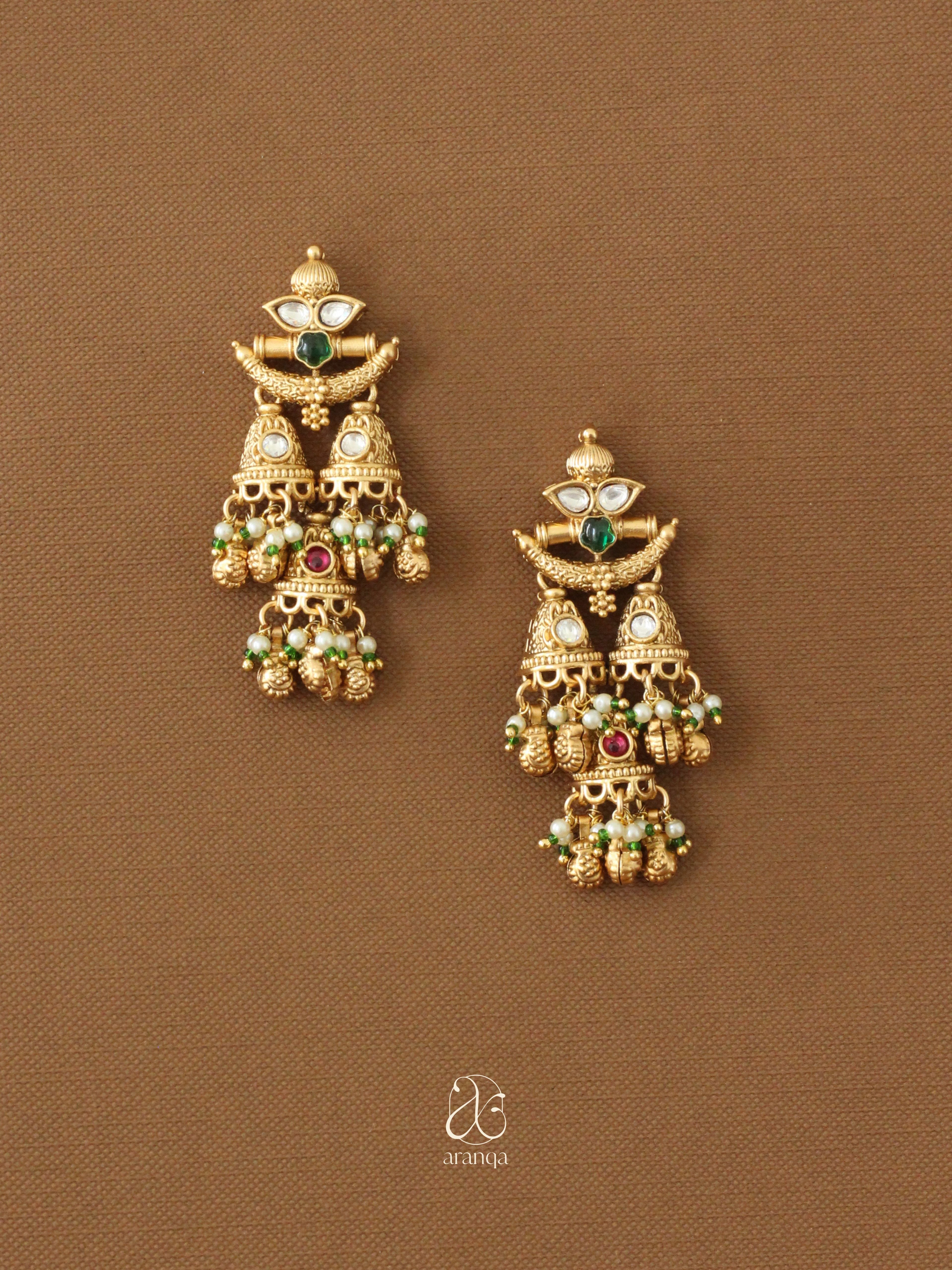 Experience divine elegance with our Kavitha Earrings—where ornate temple motifs adorned with emerald and ruby accents cascade into intricate tiered drops with lustrous pearl and bead detailing. These temple-inspired masterpieces celebrate the sacred beauty of traditional Indian craftsmanship, bringing spiritual grace and cultural heritage to life with their exquisite artistry.