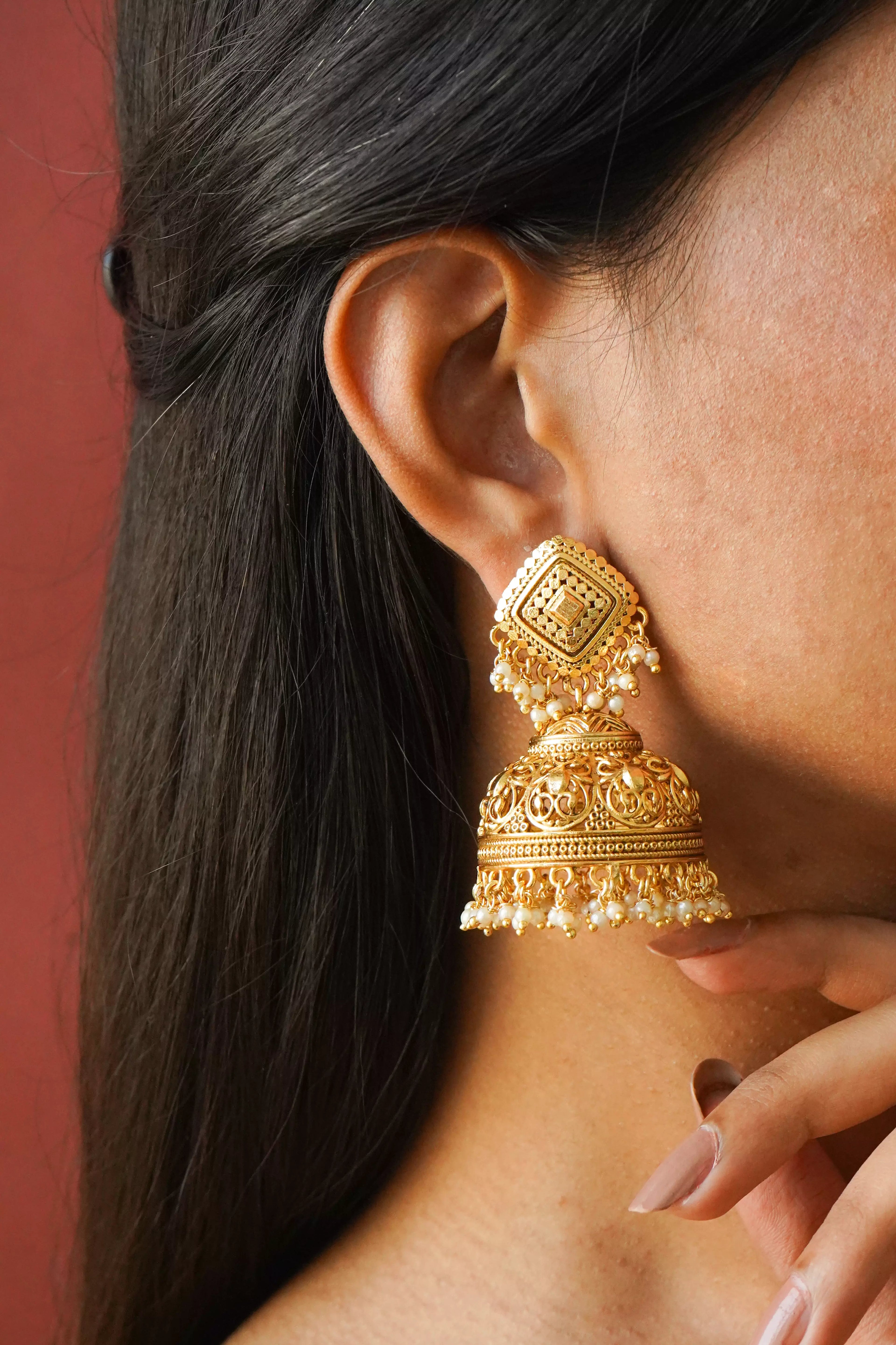 Intricate gold filigree work blooms across these magnificent jhumkas where diamond-shaped tops cascade into ornately carved domes adorned with lustrous pearl drops that dance with every movement.