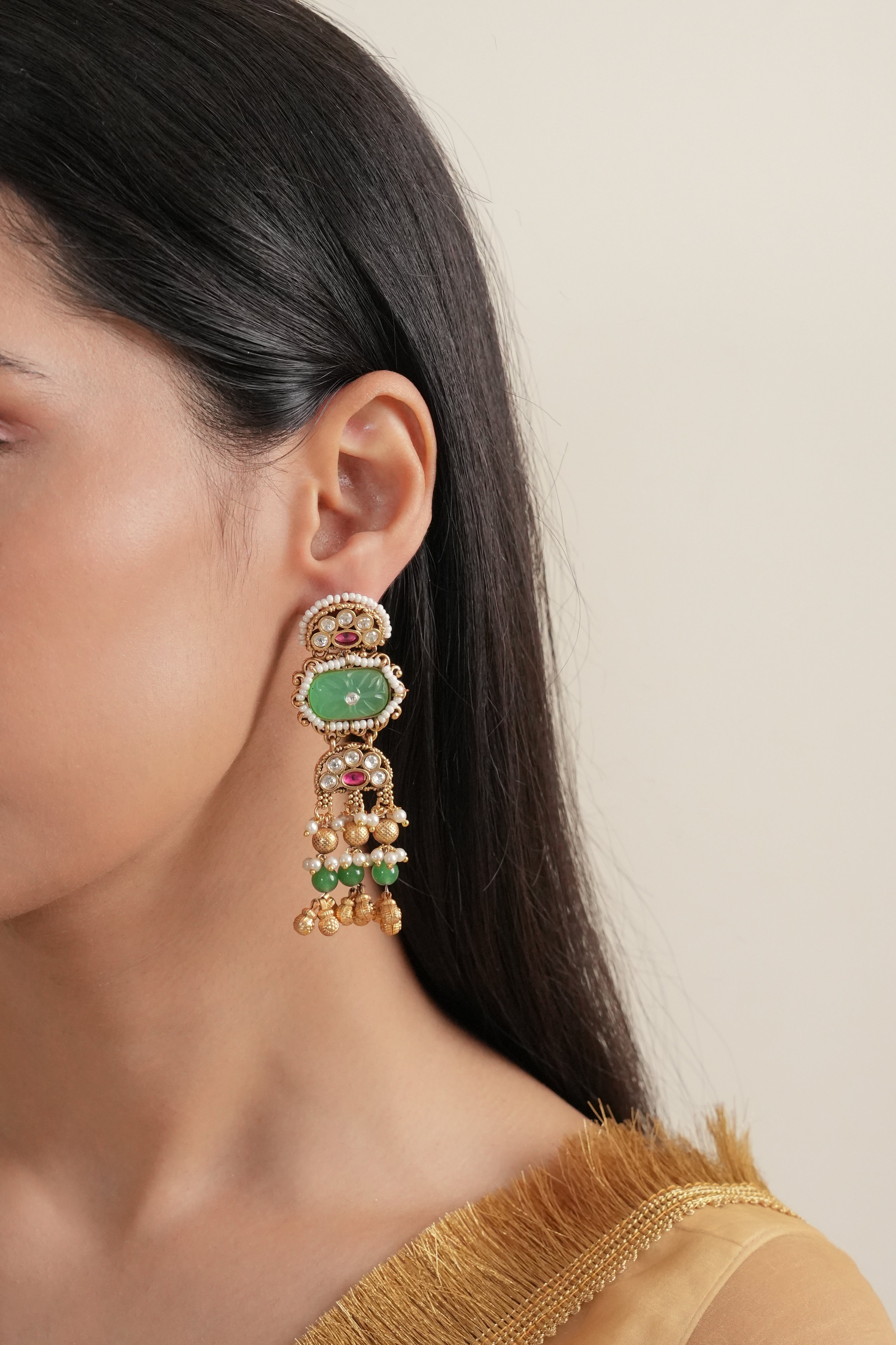 These magnificent gold-toned earrings feature vibrant green and ruby red stones in an ornate tiered design that cascades gracefully with lustrous pearl accents.