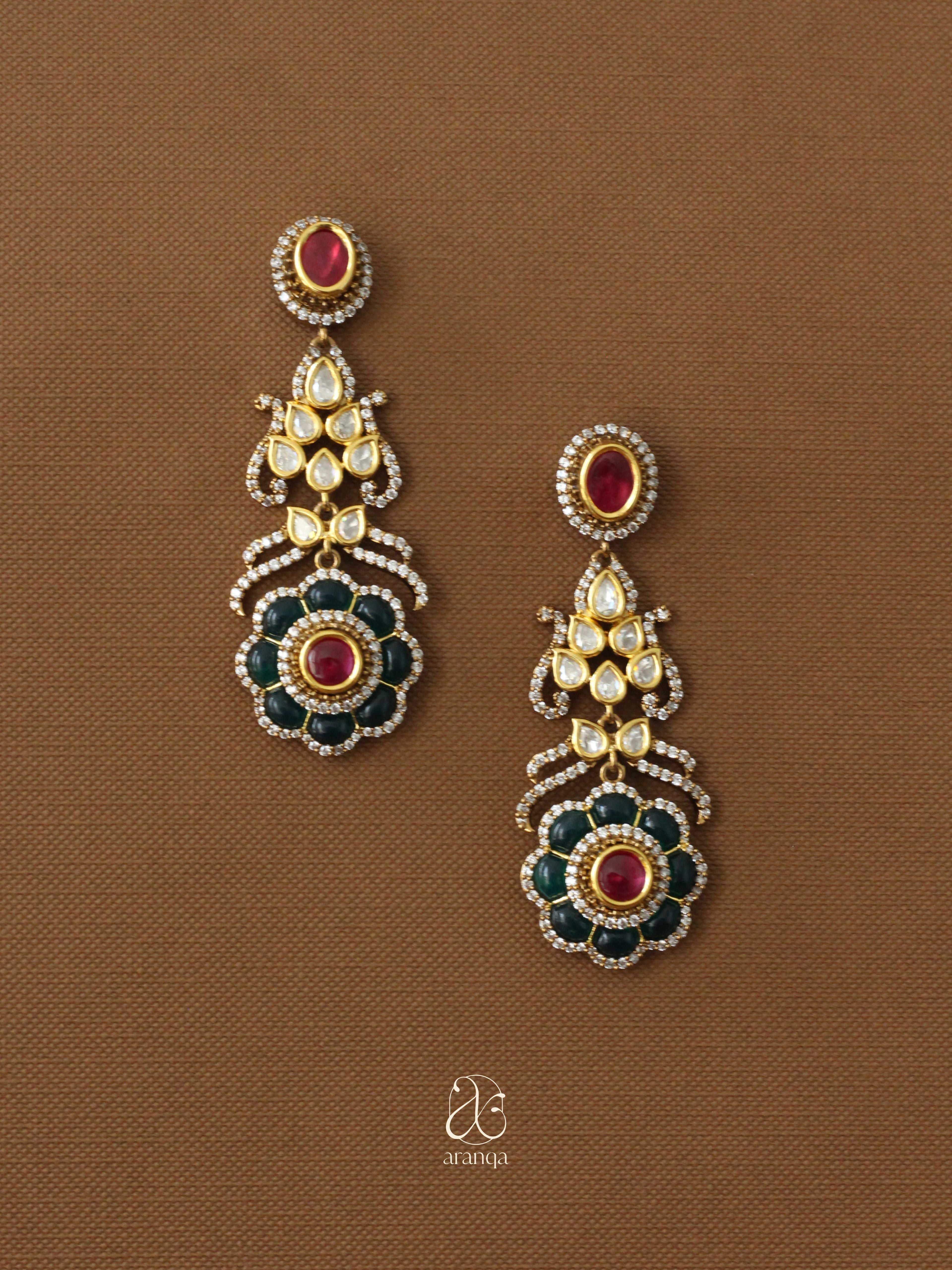 Experience vibrant elegance with our Suhana Earrings—where rich ruby tops cascade into intricate kundan work, culminating in stunning emerald and ruby floral medallions that create breathtaking color harmony. These statement pieces showcase the artistry of traditional Indian jewelry with their layered design and meticulous stonework, perfect for adding regal sophistication to festive celebrations.